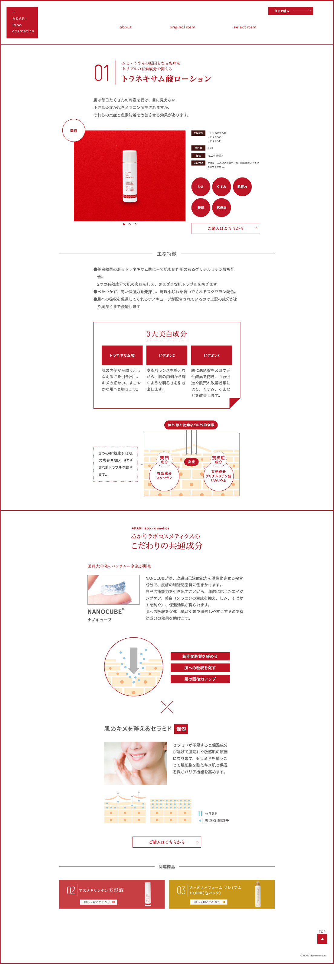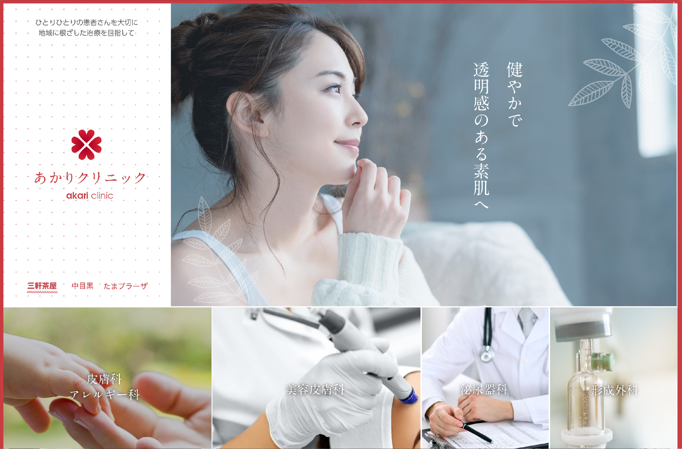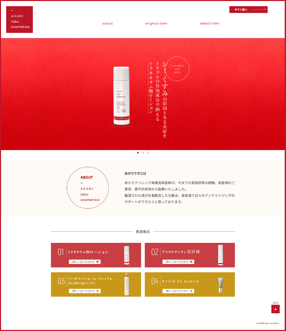 美容皮膚科のクリニックとして、三軒茶屋・中目黒・たまプラを順次開院していく際に、デザインとCMS・看板・パンフレットを作成。また、化粧品物販のあかりラボを立ち上げ、美容皮膚科の先生が作る化粧品として、商品パッケージ・ウェブをお手伝いしました。