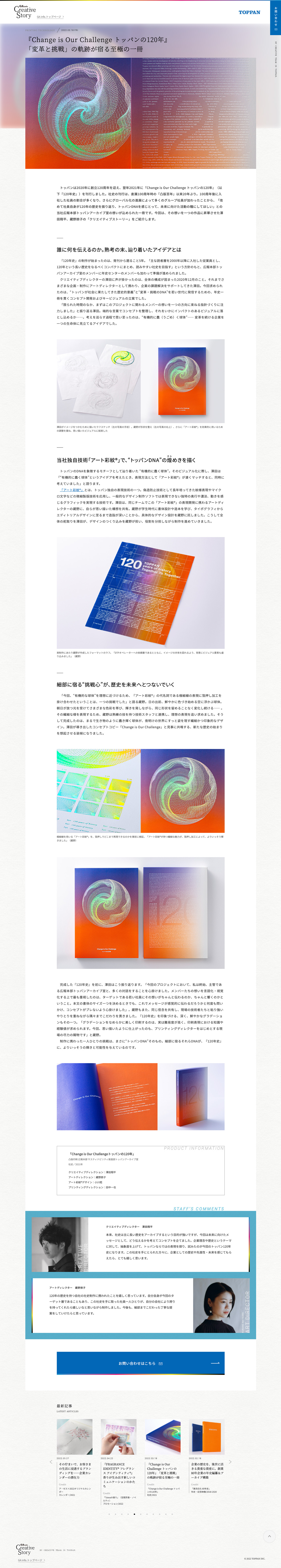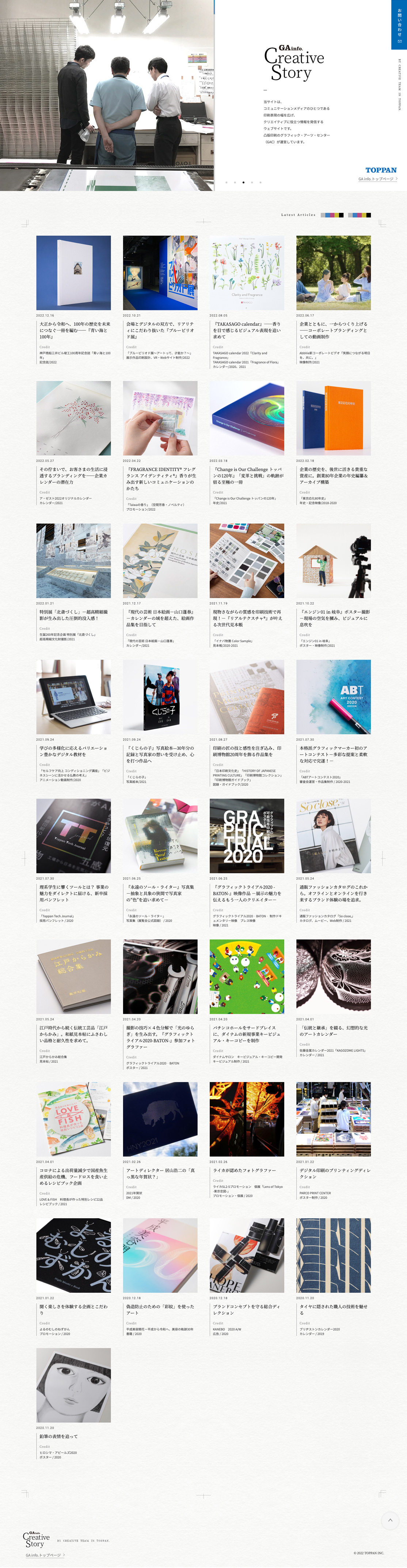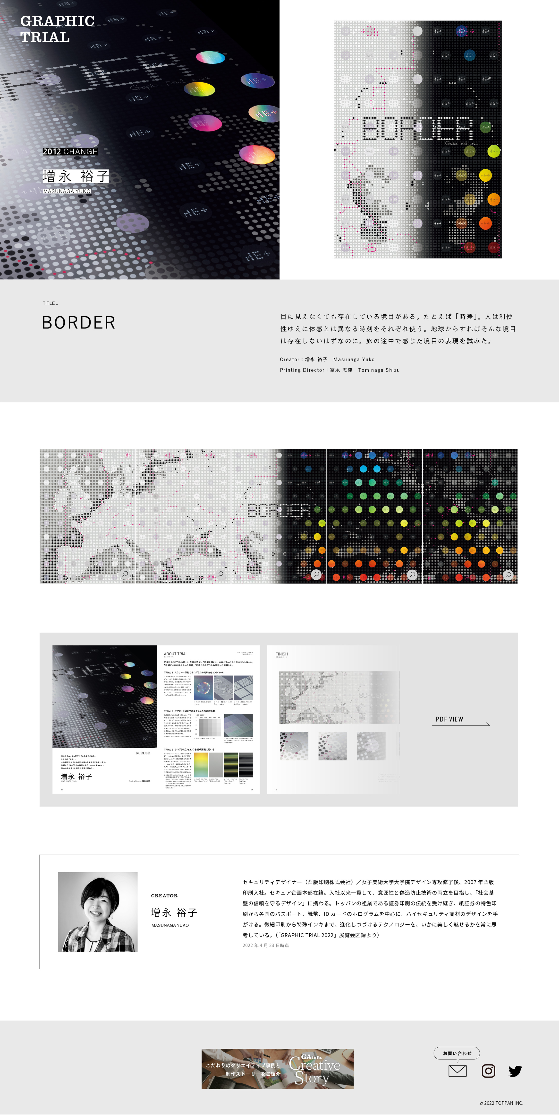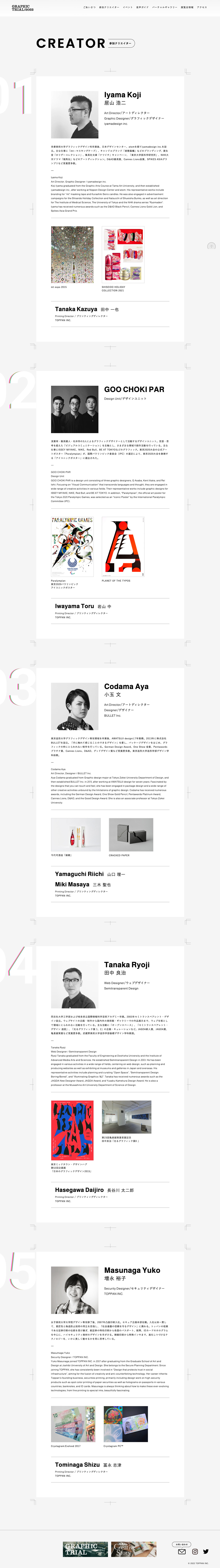 グラフィックの可能性を印刷で探るポスター展「GRAPHIC TRIAL(2006年〜)」のブランドサイトのリニューアル、および同展の2022特設サイト、また、凸版印刷クリエイティブ本部の事例とディレクターを紹介する「Creative Story」の制作を担当いたしました。
