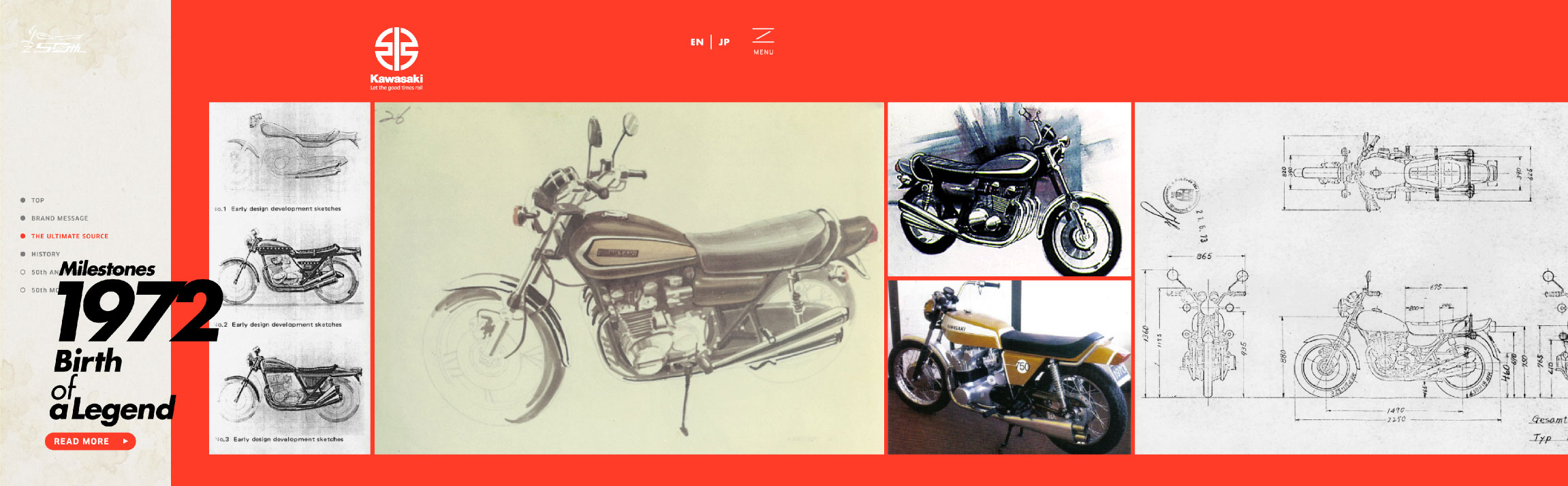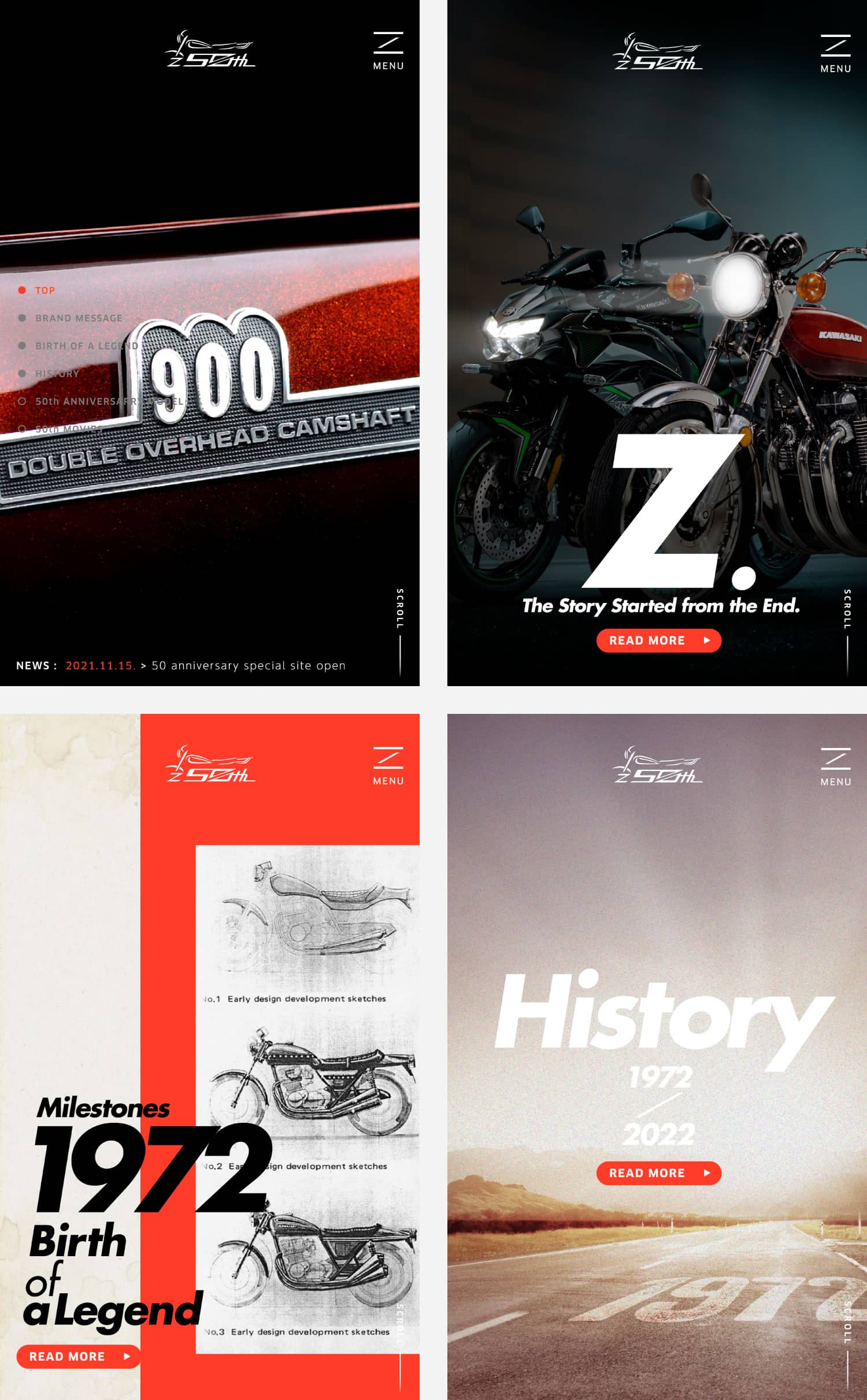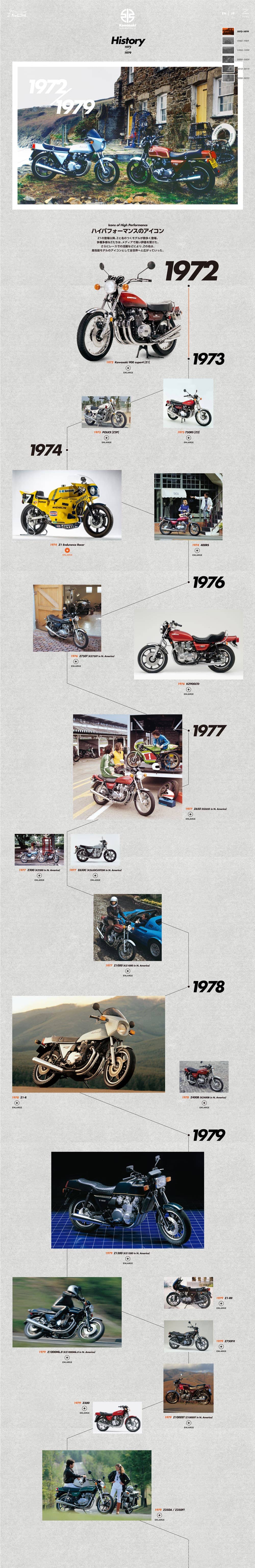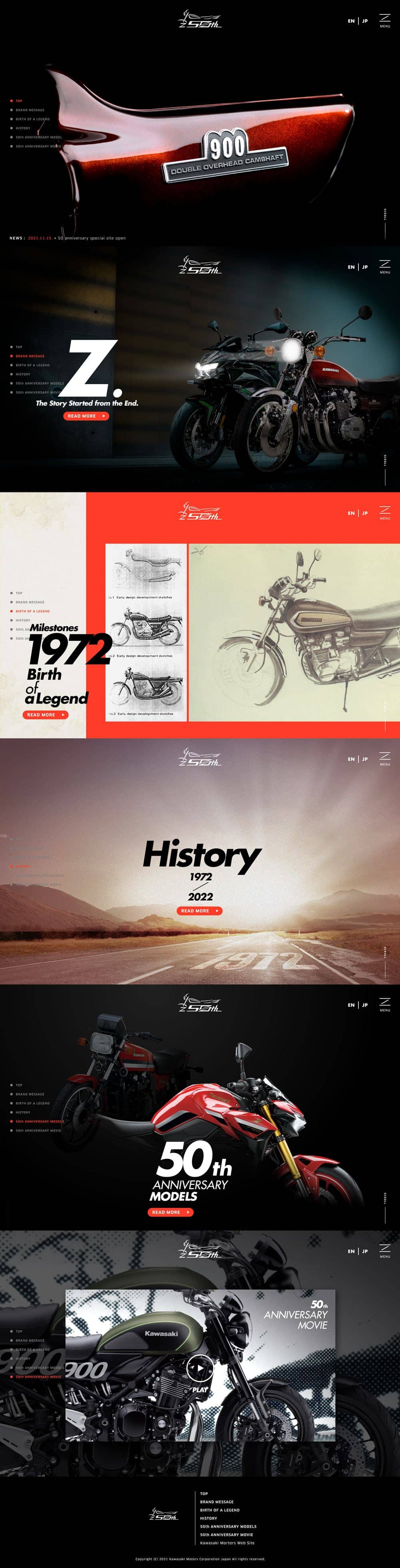 伝説の名車カワサキ「Z」。生誕50周年を記念したスペシャルサイト制作を担当させていただきました。元々魅力的なプロダクトをさらに魅力的に見せられるように、構成・書体・動き・レイアウトで表現しています。
